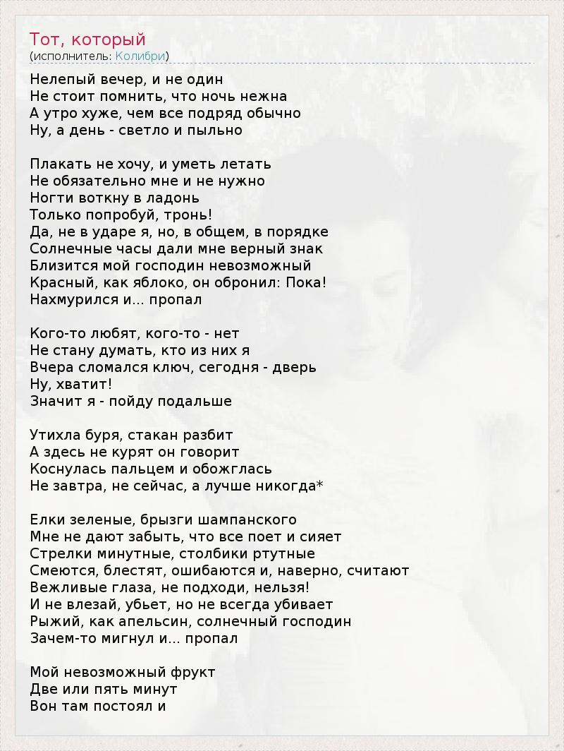 Нелепый вечер, и не один Не стоит помнить, что ночь нежна А утро хуже, чем все подряд обычно Ну, а день - светло и пыльно Плакать не хочу, и уметь летать Не обязательно мне и не нужно Ногти воткну в ладонь Только попробуй, тронь! Да, не в ударе я, но, в общем, в порядке Солнечные часы дали мне верный знак Близится мой господин невозможный Красный, как яблоко, он обронил: Пока! Нахмурился и... пропал Кого-то любят, кого-то - нет Не стану думать, кто из них я Вчера сломался ключ, сегодня - дверь Ну, хватит! Значит я - пойду подальше Утихла буря, стакан разбит А здесь не курят он говорит Коснулась пальцем и обожглась Не завтра, не сейчас, а лучше никогда* Елки зеленые, брызги шампанского Мне не дают забыть, что все поет и сияет Стрелки минутные, столбики ртутные Смеются, блестят, ошибаются и, наверно, считают Вежливые глаза, не подходи, нельзя! И не влезай, убьет, но не всегда убивает Рыжий, как апельсин, солнечный господин Зачем-то мигнул и... пропал Мой невозможный фрукт Две или пять минут Вон там постоял и