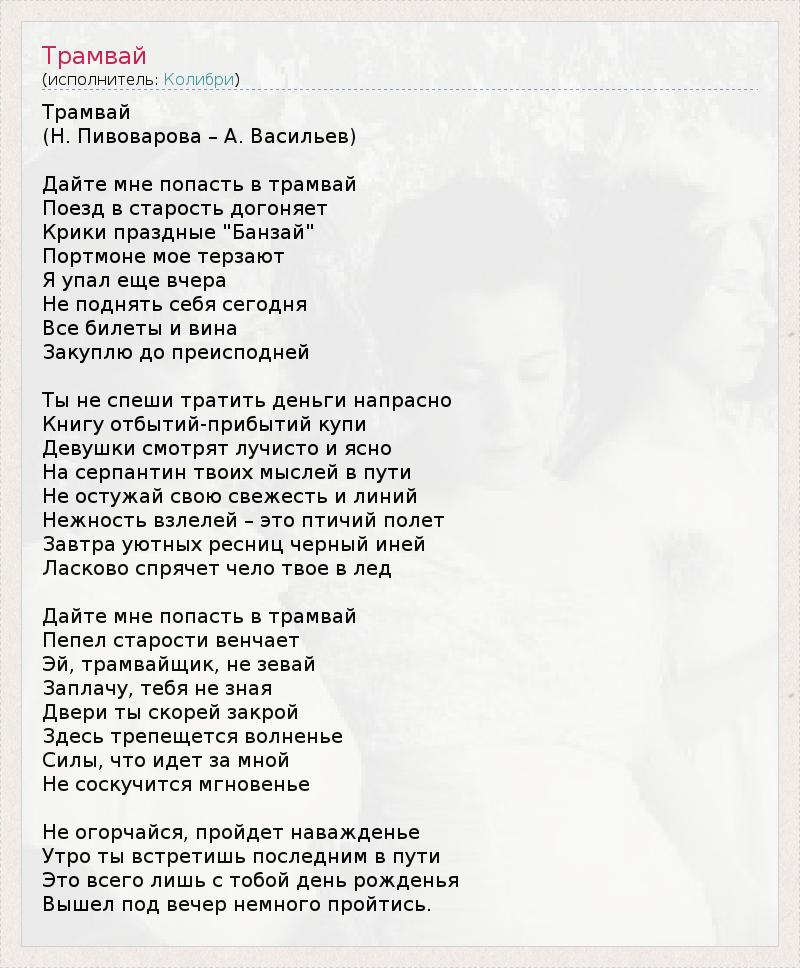 Трамвай (Н. Пивоварова – А. Васильев) Дайте мне попасть в трамвай Поезд в старость догоняет Крики праздные "Банзай" Портмоне мое терзают Я упал еще вчера Не поднять себя сегодня Все билеты и вина Закуплю до преисподней Ты не спеши тратить деньги напрасно Книгу отбытий-прибытий купи Девушки смотрят лучисто и ясно На серпантин твоих мыслей в пути Не остужай свою свежесть и линий Нежность взлелей – это птичий полет Завтра уютных ресниц черный иней Ласково спрячет чело твое в лед Дайте мне попасть в трамвай Пепел старости венчает Эй, трамвайщик, не зевай Заплачу, тебя не зная Двери ты скорей закрой Здесь трепещется волненье Силы, что идет за мной Не соскучится мгновенье Не огорчайся, пройдет наважденье Утро ты встретишь последним в пути Это всего лишь с тобой день рожденья Вышел под вечер немного пройтись.