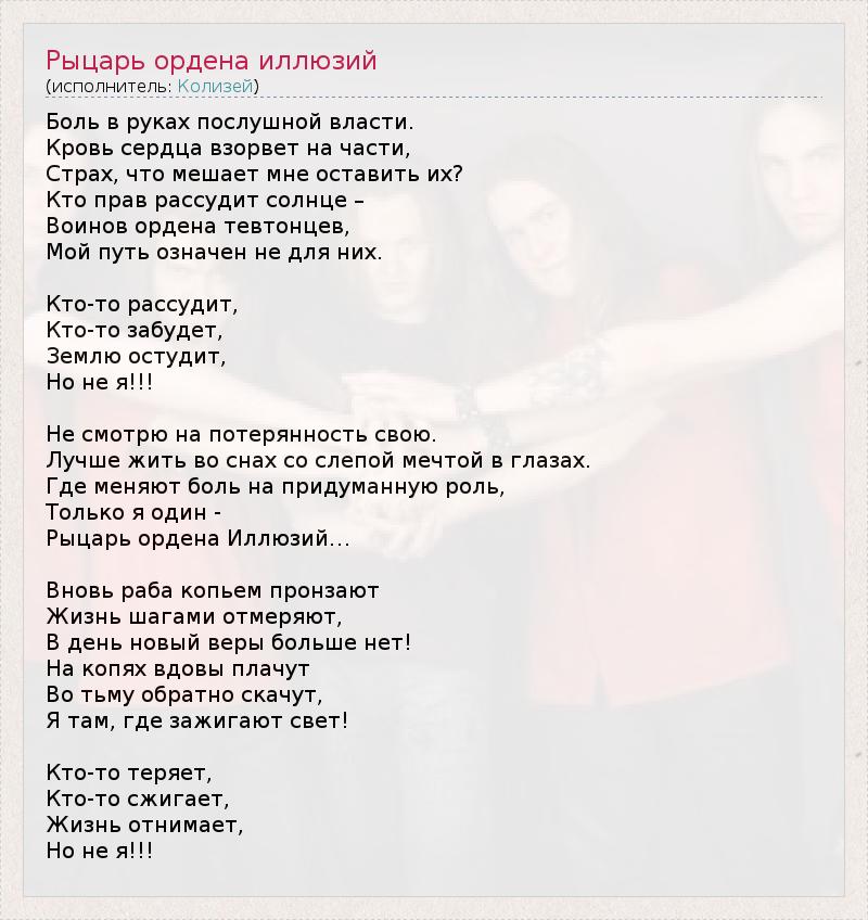 Боль в руках послушной власти. Кровь сердца взорвет на части, Страх, что мешает мне оставить их? Кто прав рассудит солнце – Воинов ордена тевтонцев, Мой путь означен не для них. Кто-то рассудит, Кто-то забудет, Землю остудит, Но не я!!! Не смотрю на потерянность свою. Лучше жить во снах со слепой мечтой в глазах. Где меняют боль на придуманную роль, Только я один - Рыцарь ордена Иллюзий… Вновь раба копьем пронзают Жизнь шагами отмеряют, В день новый веры больше нет! На копях вдовы плачут Во тьму обратно скачут, Я там, где зажигают свет! Кто-то теряет, Кто-то сжигает, Жизнь отнимает, Но не я!!!