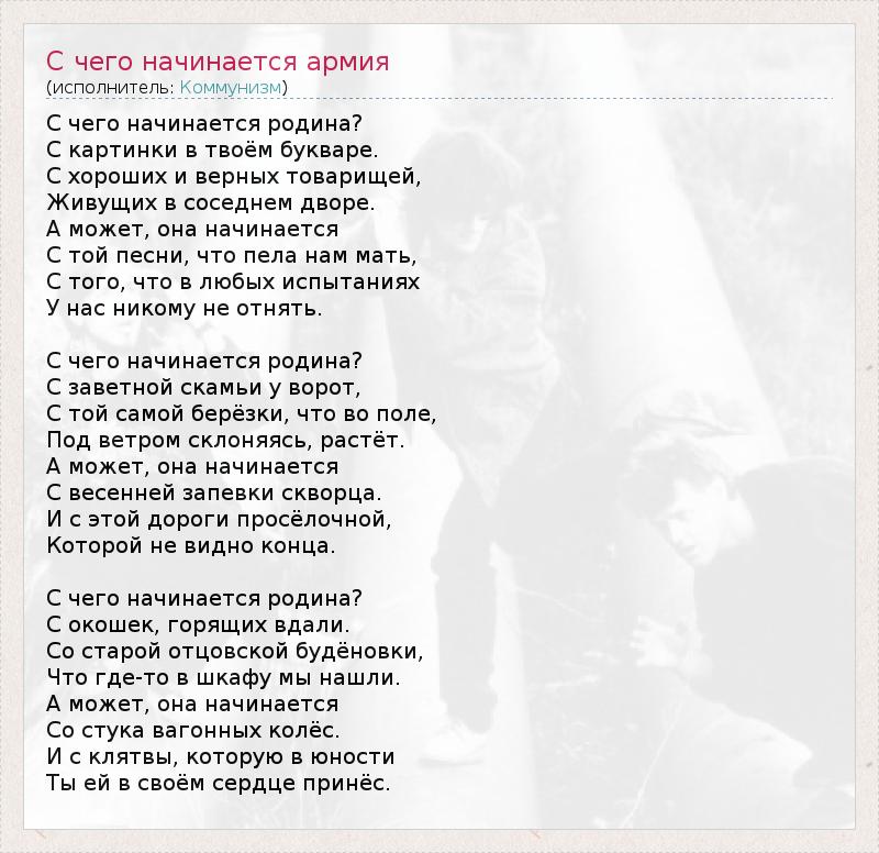 С чего начинается родина? С картинки в твоём букваре. С хороших и верных товарищей, Живущих в соседнем дворе. А может, она начинается С той песни, что пела нам мать, С того, что в любых испытаниях У нас никому не отнять. С чего начинается родина? С заветной скамьи у ворот, С той самой берёзки, что во поле, Под ветром склоняясь, растёт. А может, она начинается С весенней запевки скворца. И с этой дороги просёлочной, Которой не видно конца. С чего начинается родина? С окошек, горящих вдали. Со старой отцовской будёновки, Что где-то в шкафу мы нашли. А может, она начинается Со стука вагонных колёс. И с клятвы, которую в юности Ты ей в своём сердце принёс.