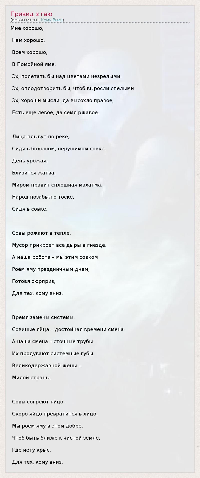 Мне хорошо, Нам хорошо, Всем хорошо, В Помойной яме. Эх, полетать бы над цветами незрелыми. Эх, оплодотворить бы, чтоб выросли спелыми. Эх, хороши мысли, да высохло правое, Есть еще левое, да семя ржавое. Лица плывут по реке, Сидя в большом, нерушимом совке. День урожая, Близится жатва, Миром правит сплошная махатма. Народ позабыл о тоске, Сидя в совке. Совы рожают в тепле. Мусор прикроет все дыры в гнезде. А наша робота – мы этим совком Роем яму праздничным днем, Готовя сюрприз, Для тех, кому вниз. Время замены системы. Совиные яйца – достойная времени смена. А наша смена – сточные трубы. Их продувают системные губы Великодержавной жены – Милой страны. Совы согреют яйцо. Скоро яйцо превратится в лицо. Мы роем яму в этом добре, Чтоб быть ближе к чистой земле, Где нету крыс. Для тех, кому вниз.