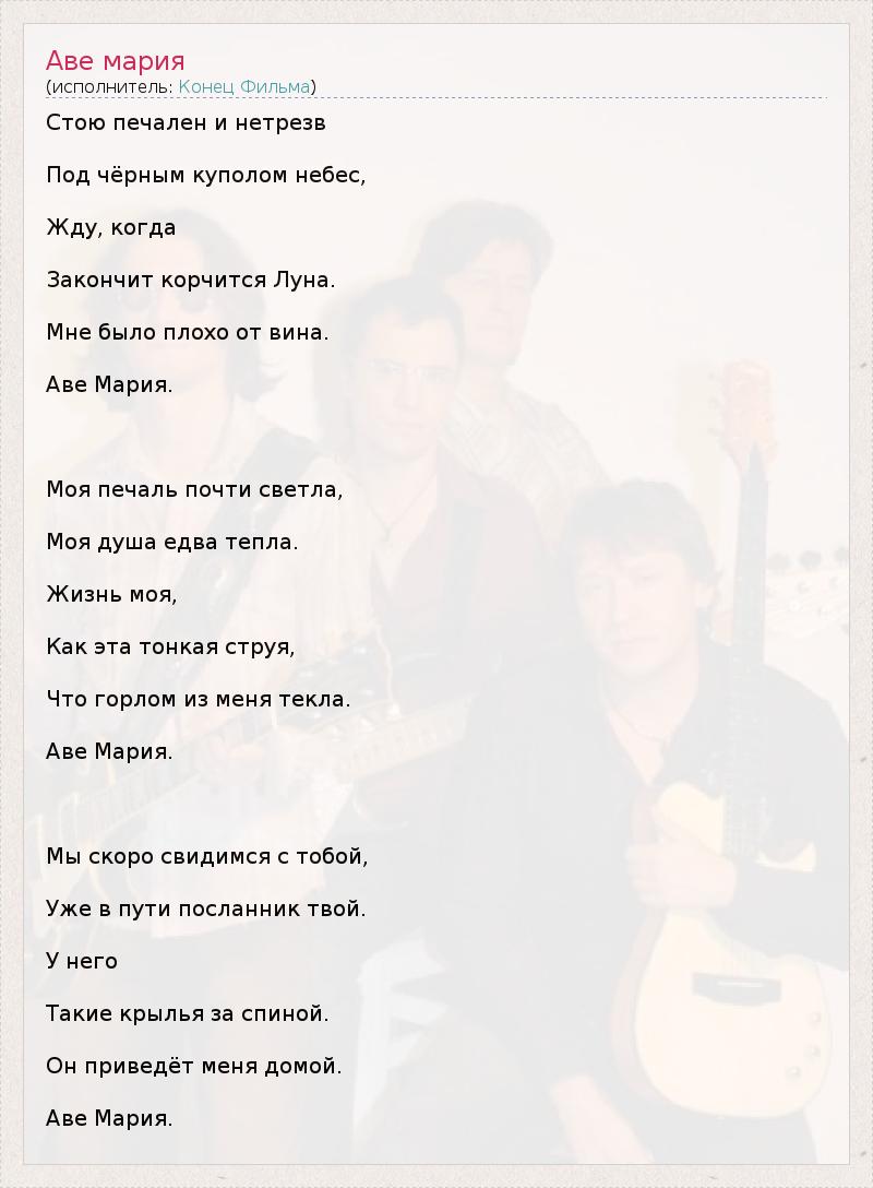 Стою печален и нетрезв Под чёрным куполом небес, Жду, когда Закончит корчится Луна. Мне было плохо от вина. Аве Мария. Моя печаль почти светла, Моя душа едва тепла. Жизнь моя, Как эта тонкая струя, Что горлом из меня текла. Аве Мария. Мы скоро свидимся с тобой, Уже в пути посланник твой. У него Такие крылья за спиной. Он приведёт меня домой. Аве Мария.