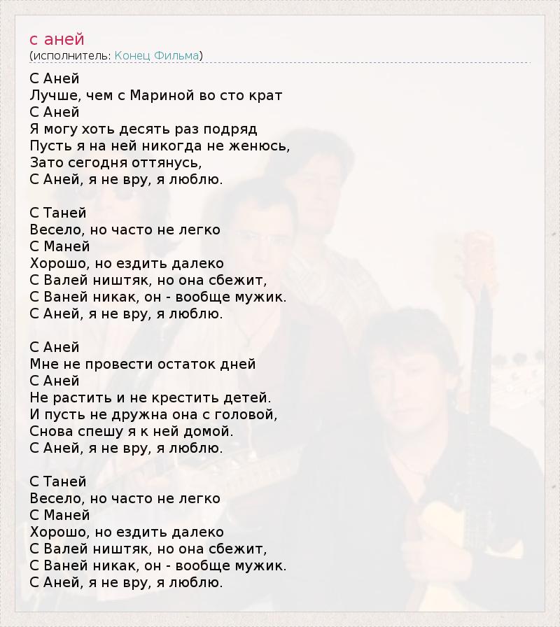 С Аней Лучше, чем с Мариной во сто крат С Аней Я могу хоть десять раз подряд Пусть я на ней никогда не женюсь, Зато сегодня оттянусь, С Аней, я не вру, я люблю. С Таней Весело, но часто не легко С Маней Хорошо, но ездить далеко С Валей ништяк, но она сбежит, С Ваней никак, он - вообще мужик. С Аней, я не вру, я люблю. С Аней Мне не провести остаток дней С Аней Не растить и не крестить детей. И пусть не дружна она с головой, Снова спешу я к ней домой. С Аней, я не вру, я люблю. С Таней Весело, но часто не легко С Маней Хорошо, но ездить далеко С Валей ништяк, но она сбежит, С Ваней никак, он - вообще мужик. С Аней, я не вру, я люблю.