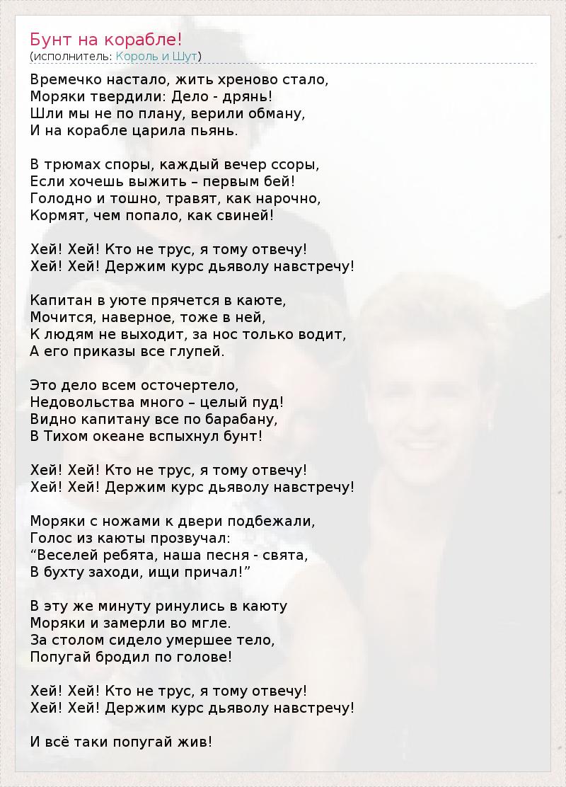 Бунт На Корабле! Времечко Настало: Жить Хреново Стало. Моряки Твердили: «Дело - Дрянь!» Шли Мы Не По Плану, Верили Обману, И На Корабле Царила Пьянь. В Трюмах - Споры, Каждый Вечер - Ссоры. Если Хочешь Выжить - Первый Бей! Голодно И Тошно, Травят Как Нарочно, Кормят, Чем Попало, Как Свиней. R: Хей! Хей! Кто Не Трус, Я Тому Отвечу! Хей! Хей! Держи Курс Дьяволу Навстречу! Капитан В Уюте Прячется В Каюте, Мочится, Наверно, Тоже В Ней! К Людям Не Выходит, За Нос Только Водит, А Его Приказы Все Дурней, Это Дело Всем Осточертело. Недовольства Много - Целый Пуд! Видно, Капитану - Все По Барабану: В Тихом Океане Вспыхнул Бунт! R: Тот Же Моряки С Ножами К Двери Подбежали. Голос Из Каюты Прозвучал: «Веселей Ребята! Наша Песня Свята! В Бухту Заходи, Ищи Причал!« В Эту Же Минуту Ринулись В Каюту Моряки И Замерли Во Мгле. За Столом Сидело Умершее Тело, Попугай Бродил По Голове! R: Тот Же