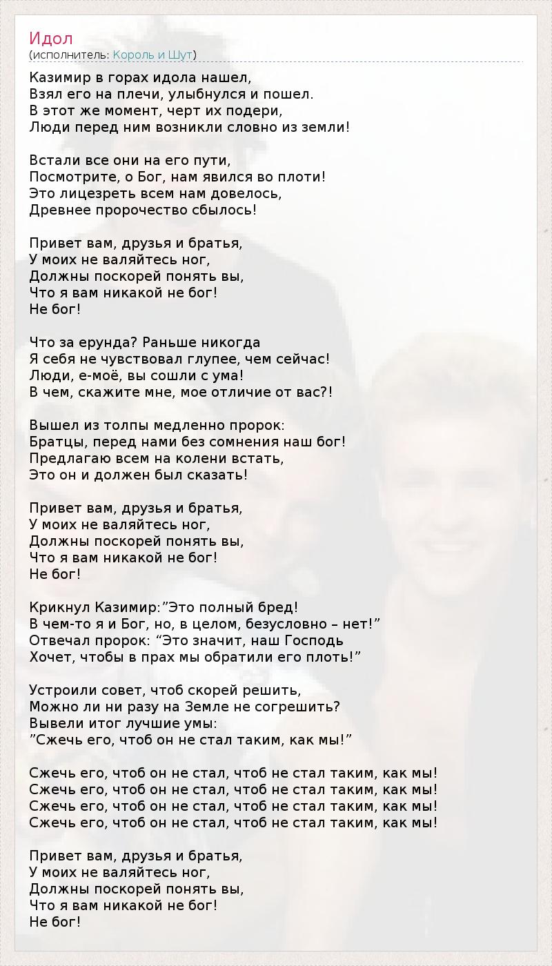 The cassimere has found in mountains of an idol, has shouldered it, has smiled and has gone. During the same moment, their lines подери, People before it have arisen as if from the earth! There were all of them on its way, Look, about God, to us was in a flesh! It to contemplate to all of us it was possible, the Ancient prophecy has come true! Greetings to you, friends and brothers, At mine don't roll feet, you Should understand more soon That I to you any not god! Not god! What for nonsense? Earlier never I felt myself more silly, than now! People, e eat, you have gone mad! In what, tell to me, my difference from you?! There was crowd slowly a prophet: Brothers, before us undoubtedly our god! I suggest all to rise on knees, It he and should tell! Greetings to you, friends and brothers, At mine don't roll feet, you Should understand more soon That I to you any not god! Not god! The Cassimere has shouted: ”It's totally ludicrous! In something I and God, but, as a whole, am unconditional – wasn't present!” The prophet Answered:“ It means, our Lord Wants, that we have turned its flesh into ashes! ”Have arranged council more soon to solve, whether It is possible to sin never on the Earth? Have deduced a result the best minds:” to Burn it that it didn't become such, as we! ”To burn it that it didn't become that didn't become such as we! To burn it that it didn't become that didn't become such as we! To burn it that it didn't become that didn't become such as we! To burn it that it didn't become that didn't become such as we! Greetings to you, friends and brothers, At mine don't roll feet, you Should understand more soon That I to you any not god! Not god!