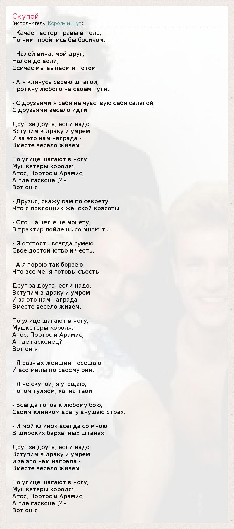 - Качает ветер травы в поле, По ним. пройтись бы босиком. - Налей вина, мой друг, Налей до воли, Сейчас мы выпьем и потом. - А я клянусь своею шпагой, Проткну любого на своем пути. - С друзьями я себя не чувствую себя салагой, С друзьями весело идти. Друг за друга, если надо, Вступим в драку и умрем. И за это нам награда - Вместе весело живем. По улице шагают в ногу. Мушкетеры короля: Атос, Портос и Арамис, А где гасконец? - Вот он я! - Друзья, скажу вам по секрету, Что я поклонник женской красоты. - Ого. нашел еще монету, В трактир пойдешь со мною ты. - Я отстоять всегда сумею Свое достоинство и честь. - А я порою так борзею, Что все меня готовы съесть! Друг за друга, если надо, Вступим в драку и умрем. И за это нам награда - Вместе весело живем. По улице шагают в ногу, Мушкетеры короля: Атос, Портос и Арамис, А где гасконец? - Вот он я! - Я разных женщин посещаю И все милы по-своему они. - Я не скупой, я угощаю, Потом гуляем, ха, на твои. - Всегда готов к любому бою, Своим клинком врагу внушаю страх. - И мой клинок всегда со мною В широких бархатных штанах. Друг за друга, если надо, Вступим в драку и умрем. и за это нам награда - Вместе весело живем. По улице шагают в ногу, Мушкетеры короля: Атос, Портос и Арамис, А где гасконец? - Вот он я!