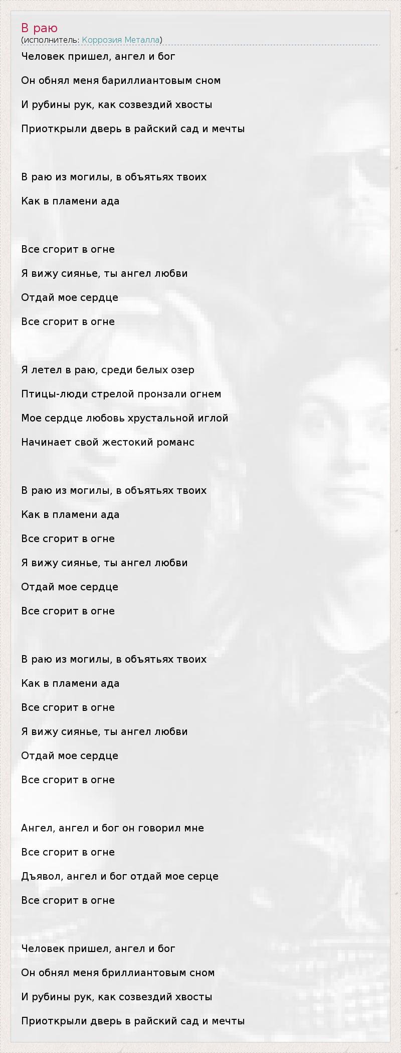 Это интересно:«Коррозия Металла» основана в Москве в 1984 году гитаристом Сергеем «Пауком» Троицким. В первый состав вошли также Сергей «Боров» Высокосов (гитара), Саша «Шизофреник» (вокал), Роман «Костыль» Лебедев (гитара), Вадим «Сакс» Михайлов (бас), Вадим «Морг» (барабаны). Первый концерт группы нелегально прошёл в подвале ЖЭКа в 1985 году и был разогнан милицией, будучи воспринят за хулиганство.В... продолжение