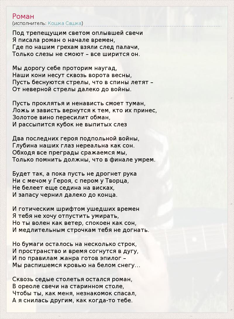 Под трепещущим светом оплывшей свечи Я писала роман о начале времен, Где по нашим грехам взяли след палачи, Только слезы не смоют – все ширится он. Мы дорогу себе проторим наугад, Наши кони несут сквозь ворота весны, Пусть беснуются стрелы, что в спины летят – От неверной стрелы далеко до войны. Пусть проклятья и ненависть смоет туман, Ложь и зависть вернутся к тем, кто их принес, Золотое вино пересилит обман, И рассыпится кубок не выпитых слез Два последних героя подпольной войны, Глубина наших глаз нереальна как сон. Обходя все преграды сражаемся мы, Только помнить должны, что в финале умрем. Будет так, а пока пусть не дрогнет рука Ни с мечом у Героя, с пером у Творца, Не белеет еще седина на висках, И запасу чернил далеко до конца. И готическим шрифтом ушедших времен Я тебя не хочу отпустить умирать, Но ты волен как ветер, спокоен как сон, И медлительным строчкам тебя не догнать. Но бумаги осталось на несколько строк, И пространство и время согнутся в дугу, И по правилам жанра готов эпилог – Мы распишемся кровью на белом снегу… Сквозь седые столетья остался роман, В ореоле свечи на старинном столе, Чтобы ты, как меня, незнакомок спасал, А я снилась другим, как когда-то тебе.