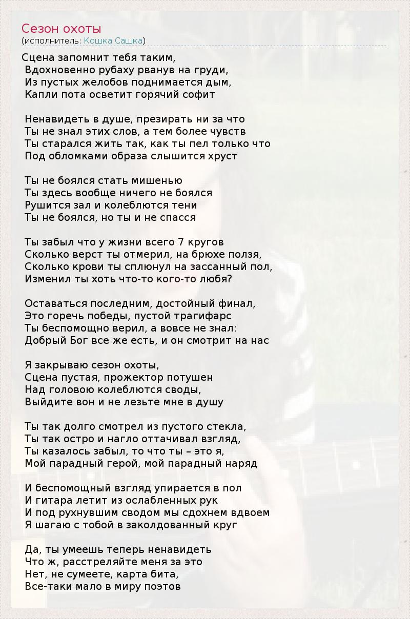 Сцена запомнит тебя таким, Вдохновенно рубаху рванув на груди, Из пустых желобов поднимается дым, Капли пота осветит горячий софит Ненавидеть в душе, презирать ни за что Ты не знал этих слов, а тем более чувств Ты старался жить так, как ты пел только что Под обломками образа слышится хруст Ты не боялся стать мишенью Ты здесь вообще ничего не боялся Рушится зал и колеблются тени Ты не боялся, но ты и не спасся Ты забыл что у жизни всего 7 кругов Сколько верст ты отмерил, на брюхе ползя, Сколько крови ты сплюнул на зассанный пол, Изменил ты хоть что-то кого-то любя? Оставаться последним, достойный финал, Это горечь победы, пустой трагифарс Ты беспомощно верил, а вовсе не знал: Добрый Бог все же есть, и он смотрит на нас Я закрываю сезон охоты, Сцена пустая, прожектор потушен Над головою колеблются своды, Выйдите вон и не лезьте мне в душу Ты так долго смотрел из пустого стекла, Ты так остро и нагло оттачивал взгляд, Ты казалось забыл, то что ты – это я, Мой парадный герой, мой парадный наряд И беспомощный взгляд упирается в пол И гитара летит из ослабленных рук И под рухнувшим сводом мы сдохнем вдвоем Я шагаю с тобой в заколдованный круг Да, ты умеешь теперь ненавидеть Что ж, расстреляйте меня за это Нет, не сумеете, карта бита, Все-таки мало в миру поэтов