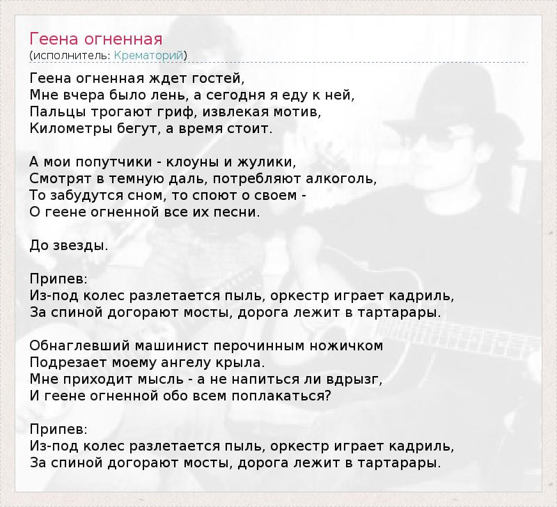 Геена огненная ждет гостей, Мне вчера было лень, а сегодня я еду к ней, Пальцы трогают гриф, извлекая мотив, Километры бегут, а время стоит. А мои попутчики - клоуны и жулики, Смотрят в темную даль, потребляют алкоголь, То забудутся сном, то споют о своем - О геене огненной все их песни. До звезды. Припев: Из-под колес разлетается пыль, оркестр играет кадриль, За спиной догорают мосты, дорога лежит в тартарары. Обнаглевший машинист перочинным ножичком Подрезает моему ангелу крыла. Мне приходит мысль - а не напиться ли вдрызг, И геене огненной обо всем поплакаться? Припев: Из-под колес разлетается пыль, оркестр играет кадриль, За спиной догорают мосты, дорога лежит в тартарары.