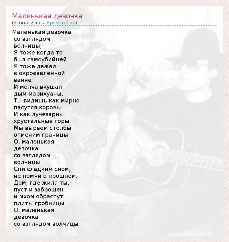 Маленькая девочка со взглядом волчицы, Я тоже когда то был самоубийцей. Я тоже лежал в окровавленной ванне И молча вкушал дым марихуаны. Ты видишь как мирно пасутся коровы И как лучезарны хрустальные горы. Мы вырвем столбы отменим границы. О, маленькая девочка со взглядом волчицы. Спи сладким сном, не помни о прошлом. Дом, где жила ты, пуст и заброшен и мхом обрастут плиты гробницы О, маленькая девочка со взглядом волчицы