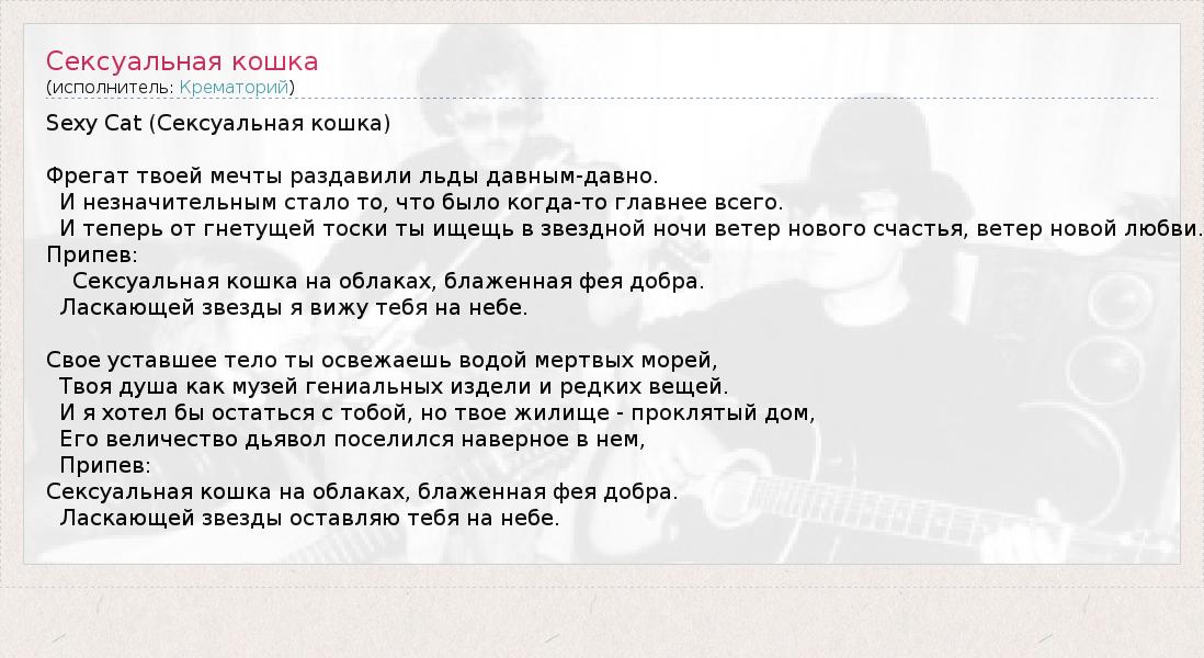 Sexy Cat (Сексуальная кошка) Фрегат твоей мечты раздавили льды давным-давно. И незначительным стало то, что было когда-то главнее всего. И теперь от гнетущей тоски ты ищещь в звездной ночи ветер нового счастья, ветер новой любви. Припев: Сексуальная кошка на облаках, блаженная фея добра. Ласкающей звезды я вижу тебя на небе. Свое уставшее тело ты освежаешь водой мертвых морей, Твоя душа как музей гениальных издели и редких вещей. И я хотел бы остаться с тобой, но твое жилище - проклятый дом, Его величество дьявол поселился наверное в нем, Припев: Сексуальная кошка на облаках, блаженная фея добра. Ласкающей звезды оставляю тебя на небе.