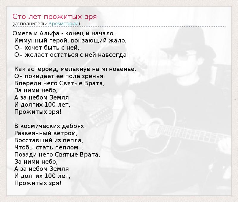 А как ты думаешь, о чем песня "Сто лет прожитых зря" ?