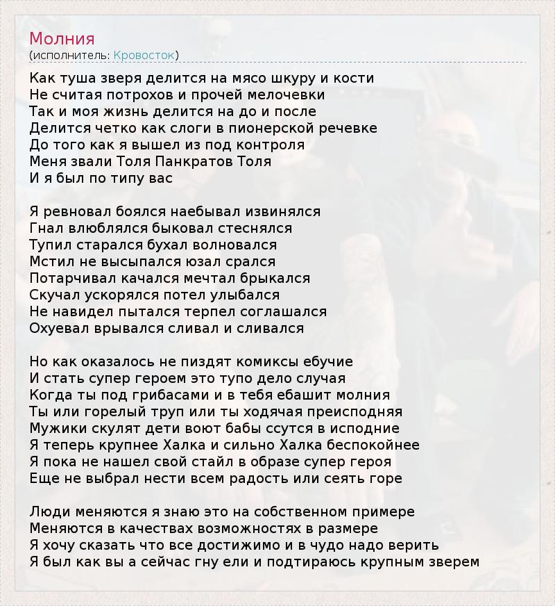 Как туша зверя делится на мясо шкуру и кости Не считая потрохов и прочей мелочевки Так и моя жизнь делится на до и после Делится четко как слоги в пионерской речевке До того как я вышел из под контроля Меня звали Толя Панкратов Толя И я был по типу вас Я ревновал боялся наебывал извинялся Гнал влюблялся быковал стеснялся Тупил старался бухал волновался Мстил не высыпался юзал срался Потарчивал качался мечтал брыкался Скучал ускорялся потел улыбался Не навидел пытался терпел соглашался Охуевал врывался сливал и сливался Но как оказалось не пиздят комиксы ебучие И стать супер героем это тупо дело случая Когда ты под грибасами и в тебя ебашит молния Ты или горелый труп или ты ходячая преисподняя Мужики скулят дети воют бабы ссутся в исподние Я теперь крупнее Халка и сильно Халка беспокойнее Я пока не нашел свой стайл в образе супер героя Еще не выбрал нести всем радость или сеять горе Люди меняются я знаю это на собственном примере Меняются в качествах возможностях в размере Я хочу сказать что все достижимо и в чудо надо верить Я был как вы а сейчас гну ели и подтираюсь крупным зверем