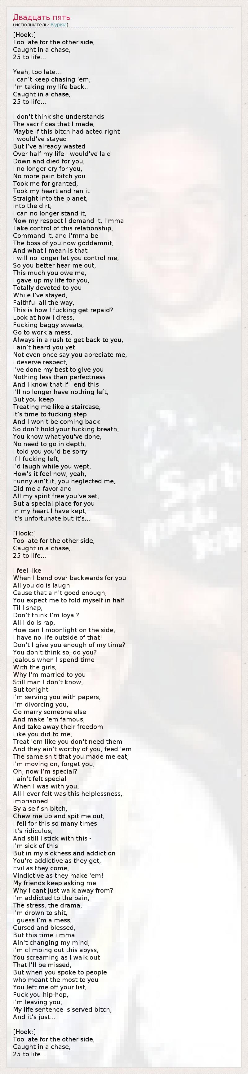 [Hook:] Too late for the other side, Caught in a chase, 25 to life... Yeah, too late... I can't keep chasing 'em, I'm taking my life back... Caught in a chase, 25 to life... I don't think she understands The sacrifices that I made, Maybe if this bitch had acted right I would've stayed But I've already wasted Over half my life I would've laid Down and died for you, I no longer cry for you, No more pain bitch you Took me for granted, Took my heart and ran it Straight into the planet, Into the dirt, I can no longer stand it, Now my respect I demand it, I'mma Take control of this relationship, Command it, and i'mma be The boss of you now goddamnit, And what I mean is that I will no longer let you control me, So you better hear me out, This much you owe me, I gave up my life for you, Totally devoted to you While I've stayed, Faithful all the way, This is how I fucking get repaid? Look at how I dress, Fucking baggy sweats, Go to work a mess, Always in a rush to get back to you, I ain't heard you yet Not even once say you apreciate me, I deserve respect, I've done my best to give you Nothing less than perfectness And I know that if I end this I'll no longer have nothing left, But you keep Treating me like a staircase, It's time to fucking step And I won't be coming back So don't hold your fucking breath, You know what you've done, No need to go in depth, I told you you'd be sorry If I fucking left, I'd laugh while you wept, How's it feel now, yeah, Funny ain't it, you neglected me, Did me a favor and All my spirit free you've set, But a special place for you In my heart I have kept, It's unfortunate but it's... [Hook:] Too late for the other side, Caught in a chase, 25 to life... I feel like When I bend over backwards for you All you do is laugh Cause that ain't good enough, You expect me to fold myself in half Til I snap, Don't think I'm loyal? All I do is rap, How can I moonlight on the side, I have no life outside of that! Don't I give you enough of my time? You don't think so, do you? Jealous when I spend time With the girls, Why I'm married to you Still man I don't know, But tonight I'm serving you with papers, I'm divorcing you, Go marry someone else And make 'em famous, And take away their freedom Like you did to me, Treat 'em like you don't need them And they ain't worthy of you, feed 'em The same shit that you made me eat, I'm moving on, forget you, Oh, now I'm special? I ain't felt special When I was with you, All I ever felt was this helplessness, Imprisoned By a selfish bitch, Chew me up and spit me out, I fell for this so many times It's ridiculus, And still I stick with this - I'm sick of this But in my sickness and addiction You're addictive as they get, Evil as they come, Vindictive as they make 'em! My friends keep asking me Why I cant just walk away from? I'm addicted to the pain, The stress, the drama, I'm drown to shit, I guess I'm a mess, Cursed and blessed, But this time i'mma Ain't changing my mind, I'm climbing out this abyss, You screaming as I walk out That I'll be missed, But when you spoke to people who meant the most to you You left me off your list, Fuck you hip-hop, I'm leaving you, My life sentence is served bitch, And it's just... [Hook:] Too late for the other side, Caught in a chase, 25 to life...