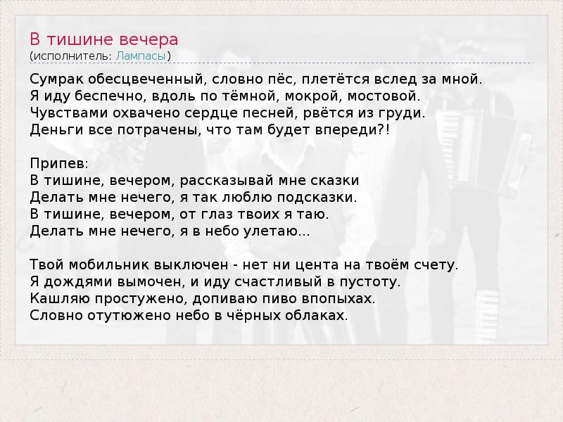 ГлавнаяИсполнителиЛампасыВ тишине вечера
