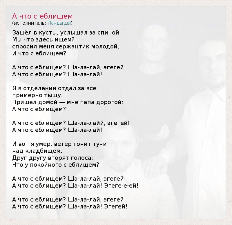 Зашёл в кусты, услышал за спиной: Мы что здесь ищем? — спросил меня сержантик молодой, — И что с еблищем? А что с еблищем? Ша-ла-лай, эгегей! А что с еблищем? Ша-ла-лай! Я в отделении отдал за всё примерно тыщу. Пришёл домой — мне папа дорогой: А что с еблищем? А что с еблищем? Ша-ла-лайй, эгегей! А что с еблищем? Ша-ла-лай! И вот я умер, ветер гонит тучи над кладбищем. Друг другу вторят голоса: Что у покойного с еблищем? А что с еблищем? Ша-ла-лай, эгегей! А что с еблищем? Ша-ла-лай! Эгеге-е-ей! А что с еблищем? Ша-ла-лай, эгегей! А что с еблищем? Ша-ла-лай! Эгегей!