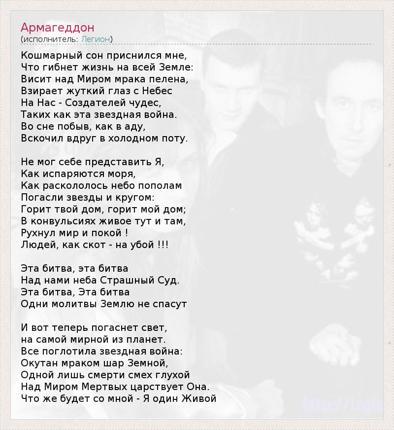 Кошмарный сон приснился мне, Что гибнет жизнь на всей Земле: Висит над Миром мрака пелена, Взирает жуткий глаз с Небес На Нас - Создателей чудес, Таких как эта звездная война. Во сне побыв, как в аду, Вскочил вдруг в холодном поту. Не мог себе представить Я, Как испаряются моря, Как раскололось небо пополам Погасли звезды и кругом: Горит твой дом, горит мой дом; В конвульсиях живое тут и там, Рухнул мир и покой ! Людей, как скот - на убой !!! Эта битва, эта битва Над нами неба Страшный Суд. Эта битва, Эта битва Одни молитвы Землю не спасут И вот теперь погаснет свет, на самой мирной из планет. Все поглотила звездная война: Окутан мраком шар Земной, Одной лишь смерти смех глухой Над Миром Мертвых царствует Она. Что же будет со мной - Я один Живой Легион - Армагеддон http://megalyrics.ru/lyric/%D0%BB%D0%B5%D0%B3%D0%B8%D0%BE%D0%BD/%D0%B0%D1%80%D0%BC%D0%B0%D0%B3%D0%B5%D0%B4%D0%B4%D0%BE%D0%BD.htm#ixzz1xxjOmImb