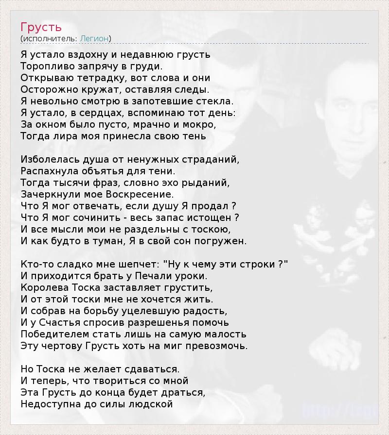 Легион - Грусть http://megalyrics.ru/lyric/%D0%BB%D0%B5%D0%B3%D0%B8%D0%BE%D0%BD/%D0%B3%D1%80%D1%83%D1%81%D1%82%D1%8C.htm#ixzz1xxjF0bE2