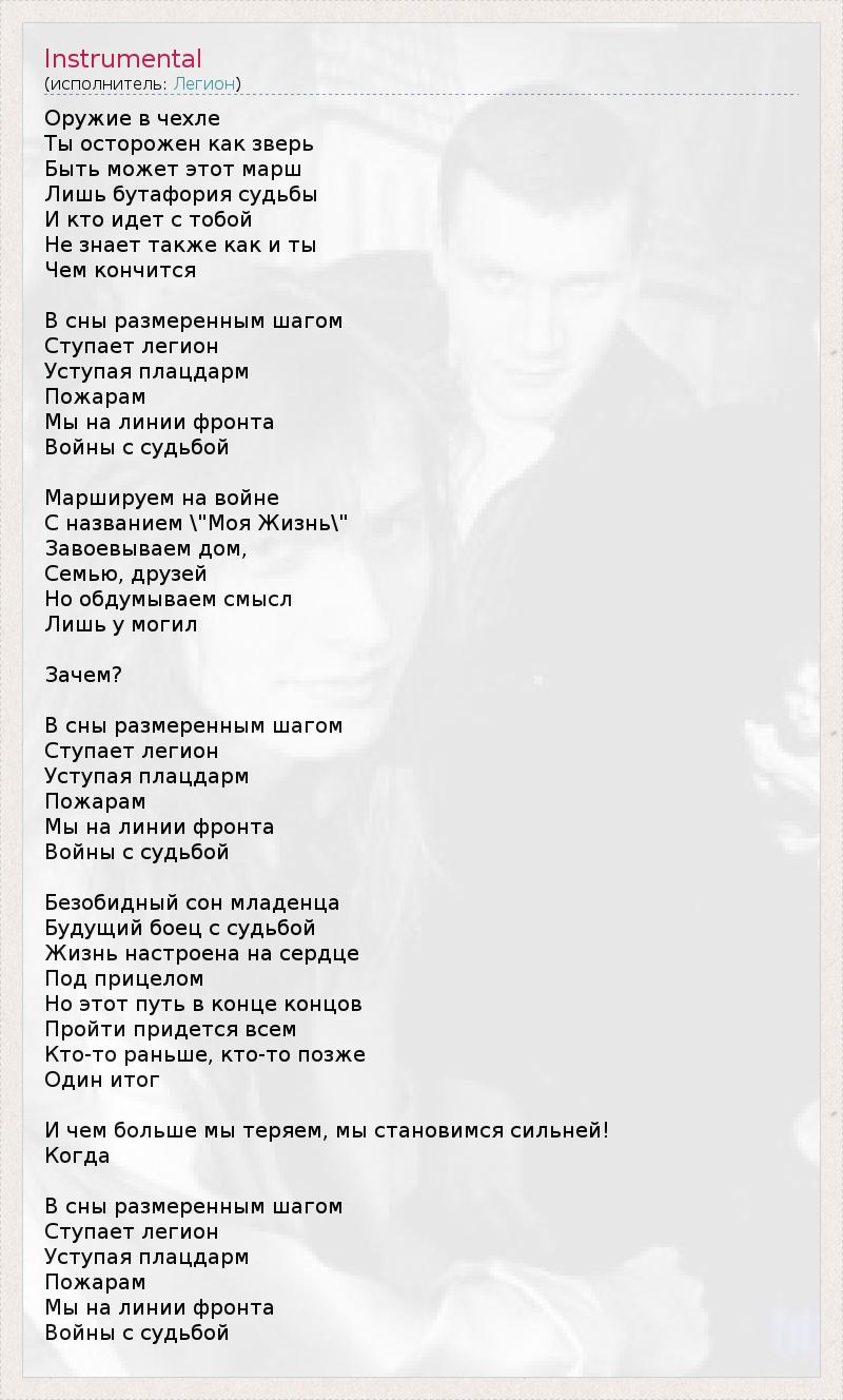 Оружие в чехле Ты осторожен как зверь Быть может этот марш Лишь бутафория судьбы И кто идет с тобой Не знает также как и ты Чем кончится В сны размеренным шагом Ступает легион Уступая плацдарм Пожарам Мы на линии фронта Войны с судьбой Маршируем на войне С названием \"Моя Жизнь\" Завоевываем дом, Семью, друзей Но обдумываем смысл Лишь у могил Зачем? В сны размеренным шагом Ступает легион Уступая плацдарм Пожарам Мы на линии фронта Войны с судьбой Безобидный сон младенца Будущий боец с судьбой Жизнь настроена на сердце Под прицелом Но этот путь в конце концов Пройти придется всем Кто-то раньше, кто-то позже Один итог И чем больше мы теряем, мы становимся сильней! Когда В сны размеренным шагом Ступает легион Уступая плацдарм Пожарам Мы на линии фронта Войны с судьбой