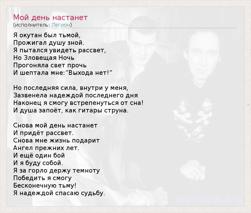Я окутан был тьмой, Прожигал душу зной. Я пытался увидеть рассвет, Но Зловещая Ночь Прогоняла свет прочь И шептала мне:”Выхода нет!” Но последняя сила, внутри у меня, Зазвенела надеждой последнего дня Наконец я смогу встрепенуться от сна! И душа запоёт, как гитары струна. Снова мой день настанет И придёт рассвет. Снова мне жизнь подарит Ангел прежних лет. И ещё один бой И я буду собой. Я за горло держу темноту Победить я смогу Бесконечную тьму! Я надеждой спасаю судьбу.