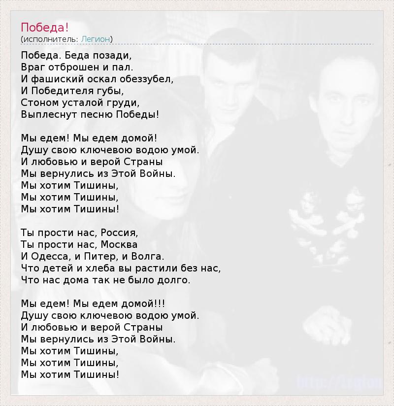 Победа. Беда позади, Враг отброшен и пал. И фашиский оскал обеззубел, И Победителя губы, Стоном усталой груди, Выплеснут песню Победы! Мы едем! Мы едем домой! Душу свою ключевою водою умой. И любовью и верой Страны Мы вернулись из Этой Войны. Мы хотим Тишины, Мы хотим Тишины, Мы хотим Тишины! Ты прости нас, Россия, Ты прости нас, Москва И Одесса, и Питер, и Волга. Что детей и хлеба вы растили без нас, Что нас дома так не было долго. Мы едем! Мы едем домой!!! Душу свою ключевою водою умой. И любовью и верой Страны Мы вернулись из Этой Войны. Мы хотим Тишины, Мы хотим Тишины, Мы хотим Тишины!