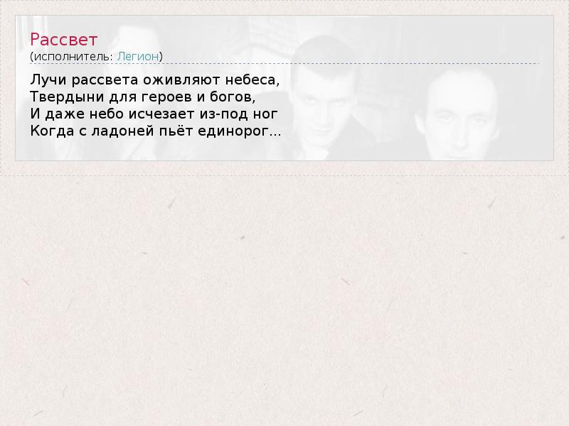 Лучи рассвета оживляют небеса, Твердыни для героев и богов, И даже небо исчезает из-под ног Когда с ладоней пьёт единорог...