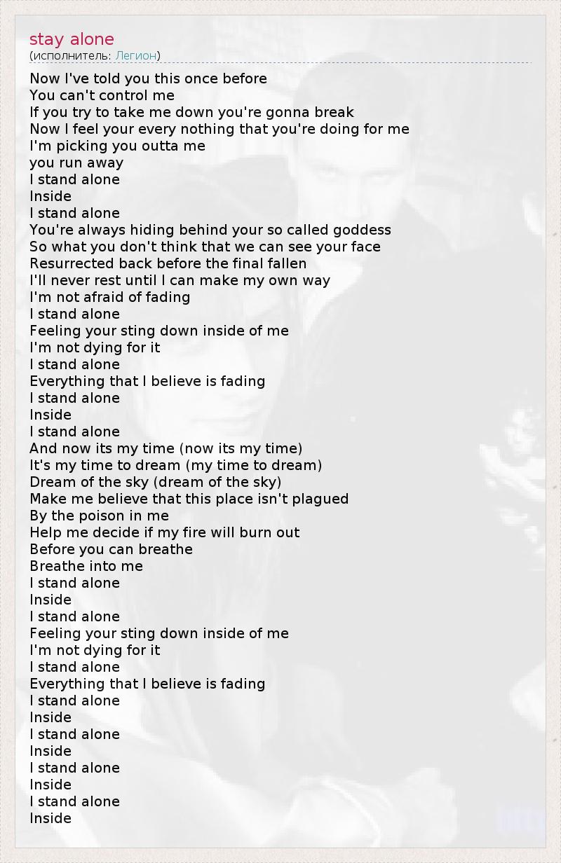 Now I've told you this once before You can't control me If you try to take me down you're gonna break Now I feel your every nothing that you're doing for me I'm picking you outta me you run away I stand alone Inside I stand alone You're always hiding behind your so called goddess So what you don't think that we can see your face Resurrected back before the final fallen I'll never rest until I can make my own way I'm not afraid of fading I stand alone Feeling your sting down inside of me I'm not dying for it I stand alone Everything that I believe is fading I stand alone Inside I stand alone And now its my time (now its my time) It's my time to dream (my time to dream) Dream of the sky (dream of the sky) Make me believe that this place isn't plagued By the poison in me Help me decide if my fire will burn out Before you can breathe Breathe into me I stand alone Inside I stand alone Feeling your sting down inside of me I'm not dying for it I stand alone Everything that I believe is fading I stand alone Inside I stand alone Inside I stand alone Inside I stand alone Inside