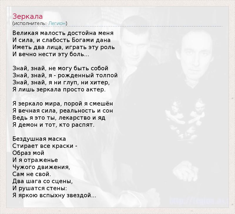 Великая малость достойна меня И сила, и слабость Богами дана Иметь два лица, играть эту роль И вечно нести эту боль... Знай, знай, не могу быть собой Знай, знай, я - рожденный толпой Знай, знай, я ни глуп, ни хитер, Я лишь зеркала просто актер. Я зеркало мира, порой я смешён Я вечная сила, реальность и сон Ведь я это ты, лекарство и яд Я демон и тот, кто распят. Бездушная маска Стирает все краски - Образ мой И я отраженье Чужого движения, Сам не свой. Два шага со сцены, И рушатся стены: Я яркою вспыхну звездой... Легион - Не могу быть собой http://megalyrics.ru/lyric/%D0%BB%D0%B5%D0%B3%D0%B8%D0%BE%D0%BD/%D0%BD%D0%B5-%D0%BC%D0%BE%D0%B3%D1%83-%D0%B1%D1%8B%D1%82%D1%8C-%D1%81%D0%BE%D0%B1%D0%BE%D0%B9.htm#ixzz1xxpXsh7W