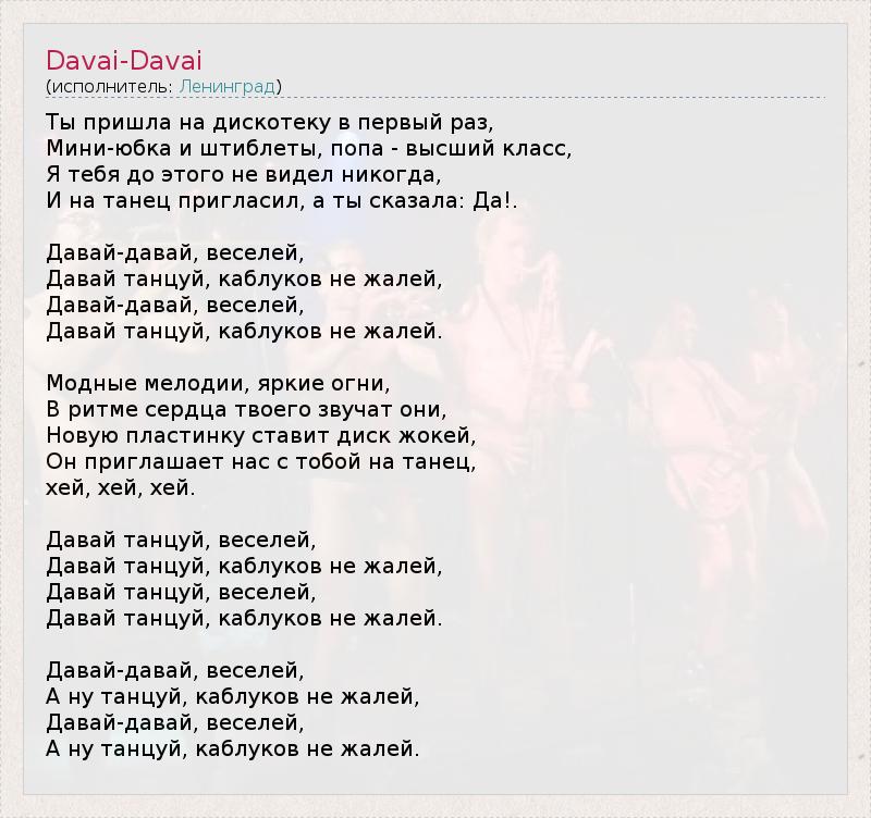 Ты пришла на дискотеку в первый раз, Мини-юбка и штиблеты, попа - высший класс, Я тебя до этого не видел никогда, И на танец пригласил, а ты сказала: Да!. Давай-давай, веселей, Давай танцуй, каблуков не жалей, Давай-давай, веселей, Давай танцуй, каблуков не жалей. Модные мелодии, яркие огни, В ритме сердца твоего звучат они, Новую пластинку ставит диск жокей, Он приглашает нас с тобой на танец, хей, хей, хей. Давай танцуй, веселей, Давай танцуй, каблуков не жалей, Давай танцуй, веселей, Давай танцуй, каблуков не жалей. Давай-давай, веселей, А ну танцуй, каблуков не жалей, Давай-давай, веселей, А ну танцуй, каблуков не жалей.