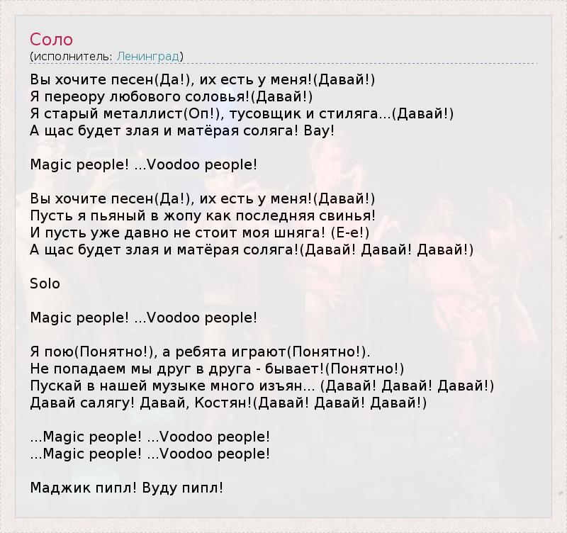 Это интересно:Оф. сайт | Facebook | YouTube | Twitter | ВКонтакте | iTunes Группу «Ленинград» правильней было бы определить как оркестр. Духовая секция — тромбон, саксофон, труба, туба — в сочетании с ксилофоном, гитарами, барабанами... продолжение
