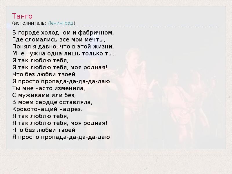Это интересно:Оф. сайт | Facebook | YouTube | Twitter | ВКонтакте | iTunes Группу «Ленинград» правильней было бы определить как оркестр. Духовая секция — тромбон, саксофон, труба, туба — в сочетании с ксилофоном, гитарами, барабанами... продолжение