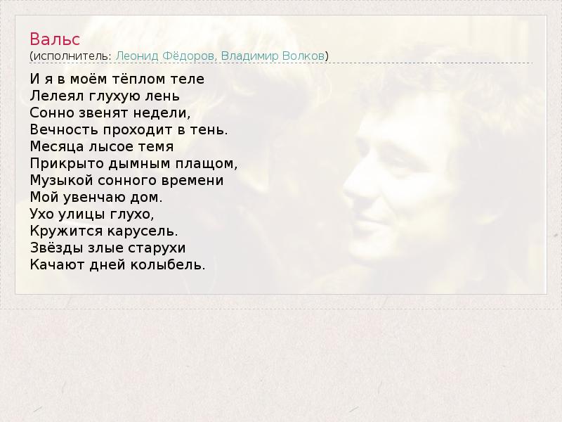 Это интересно:В конце 1990-х, не прекращая работать и выступать в составе "АукцЫона", Леонид Фёдоров стал известен и как сольный исполнитель. Его акустический дебютный CD «Четыресполовинойтонны» увидел свет в 1997 году. Последовавшая затем активная работа совместно с прогрессивным этноджазовым проектом «Волковтрио» нашла своё отражение в записях, изданных на дисках «Зимы не будет» (2000) и «Анабэна»... продолжение