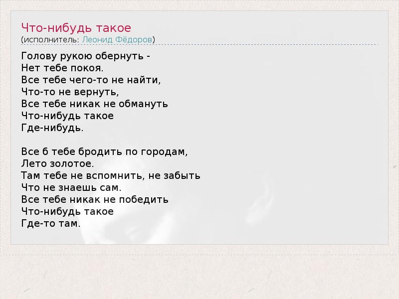 Голову рукою обернуть - Нет тебе покоя. Все тебе чего-то не найти, Что-то не вернуть, Все тебе никак не обмануть Что-нибудь такое Где-нибудь. Все б тебе бродить по городам, Лето золотое. Там тебе не вспомнить, не забыть Что не знаешь сам. Все тебе никак не победить Что-нибудь такое Где-то там.