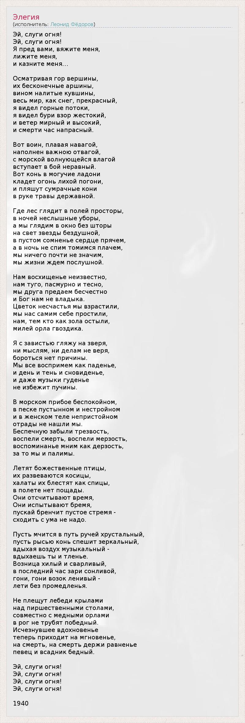 Эй, слуги огня! Эй, слуги огня! Я пред вами, вяжите меня, лижите меня, и казните меня… Осматривая гор вершины, их бесконечные аршины, вином налитые кувшины, весь мир, как снег, прекрасный, я видел горные потоки, я видел бури взор жестокий, и ветер мирный и высокий, и смерти час напрасный. Вот воин, плавая навагой, наполнен важною отвагой, с морской волнующейся влагой вступает в бой неравный. Вот конь в могучие ладони кладет огонь лихой погони, и пляшут сумрачные кони в руке травы державной. Где лес глядит в полей просторы, в ночей неслышные уборы, а мы глядим в окно без шторы на свет звезды бездушной, в пустом сомненье сердце прячем, а в ночь не спим томимся плачем, мы ничего почти не значим, мы жизни ждем послушной. Нам восхищенье неизвестно, нам туго, пасмурно и тесно, мы друга предаем бесчестно и Бог нам не владыка. Цветок несчастья мы взрастили, мы нас самим себе простили, нам, тем кто как зола остыли, милей орла гвоздика. Я с завистью гляжу на зверя, ни мыслям, ни делам не веря, бороться нет причины. Мы все воспримем как паденье, и день и тень и сновиденье, и даже музыки гуденье не избежит пучины. В морском прибое беспокойном, в песке пустынном и нестройном и в женском теле непристойном отрады не нашли мы. Беспечную забыли трезвость, воспели смерть, воспели мерзость, воспоминанье мним как дерзость, за то мы и палимы. Летят божественные птицы, их развеваются косицы, халаты их блестят как спицы, в полете нет пощады. Они отсчитывают время, Они испытывают бремя, пускай бренчит пустое стремя - сходить с ума не надо. Пусть мчится в путь ручей хрустальный, пусть рысью конь спешит зеркальный, вдыхая воздух музыкальный - вдыхаешь ты и тленье. Возница хилый и сварливый, в последний час зари сонливой, гони, гони возок ленивый - лети без промедленья. Не плещут лебеди крылами над пиршественными столами, совместно с медными орлами в рог не трубят победный. Исчезнувшее вдохновенье теперь приходит на мгновенье, на смерть, на смерть держи равненье певец и всадник бедный. Эй, слуги огня! Эй, слуги огня! Эй, слуги огня! Эй, слуги огня! 1940