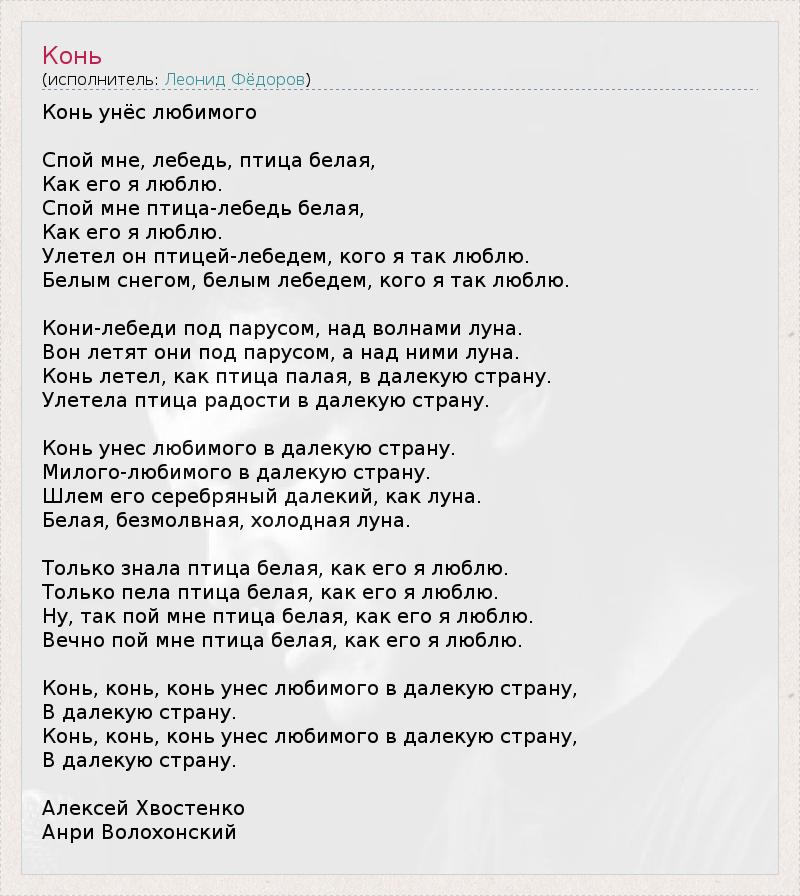 Конь унёс любимого Спой мне, лебедь, птица белая, Как его я люблю. Спой мне птица-лебедь белая, Как его я люблю. Улетел он птицей-лебедем, кого я так люблю. Белым снегом, белым лебедем, кого я так люблю. Кони-лебеди под парусом, над волнами луна. Вон летят они под парусом, а над ними луна. Конь летел, как птица палая, в далекую страну. Улетела птица радости в далекую страну. Конь унес любимого в далекую страну. Милого-любимого в далекую страну. Шлем его серебряный далекий, как луна. Белая, безмолвная, холодная луна. Только знала птица белая, как его я люблю. Только пела птица белая, как его я люблю. Ну, так пой мне птица белая, как его я люблю. Вечно пой мне птица белая, как его я люблю. Конь, конь, конь унес любимого в далекую страну, В далекую страну. Конь, конь, конь унес любимого в далекую страну, В далекую страну. Алексей Хвостенко Анри Волохонский