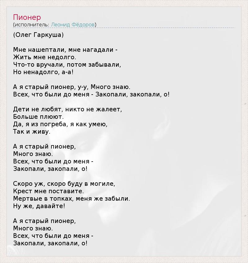 Это интересно:Леонид Валентинович Фёдоров (род. 8 января 1963 в Санкт-Петербурге) — русский авангардный рок-музыкант, лидер группы АукцЫон.За последние 20 лет Леонид Фёдоров справедливо заслужил репутацию одного из лидеров независимой рок-музыки в России. Уроженец Санкт-Петербурга (ранее — Ленинграда), в 80-е гг. ХХ века ставшего центром отечественной рок-культуры,... продолжение