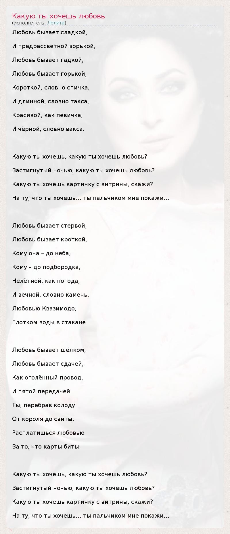 ГлавнаяИсполнителиЛолитаКакую ты хочешь любовь