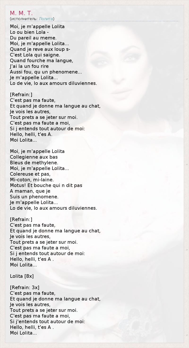 Это интересно:Существует 3 исполнителя под именем Лолита:1. Лолита Милявская2. Лолита (1987)3. Лолита (1990-1993)1) Лолита Марковна Милявская (урожд. Горелик; укр. Лоліта Марківна Мілявська, русин. Лоліта Марківна Мілявська, Lolita Horelik-Milavska) — российская певица, актриса, телеведущая и режиссёр, больше известная под сценическим псевдонимом Лолита.БиографияЛолита Милявская родилась 14 ноября... продолжение