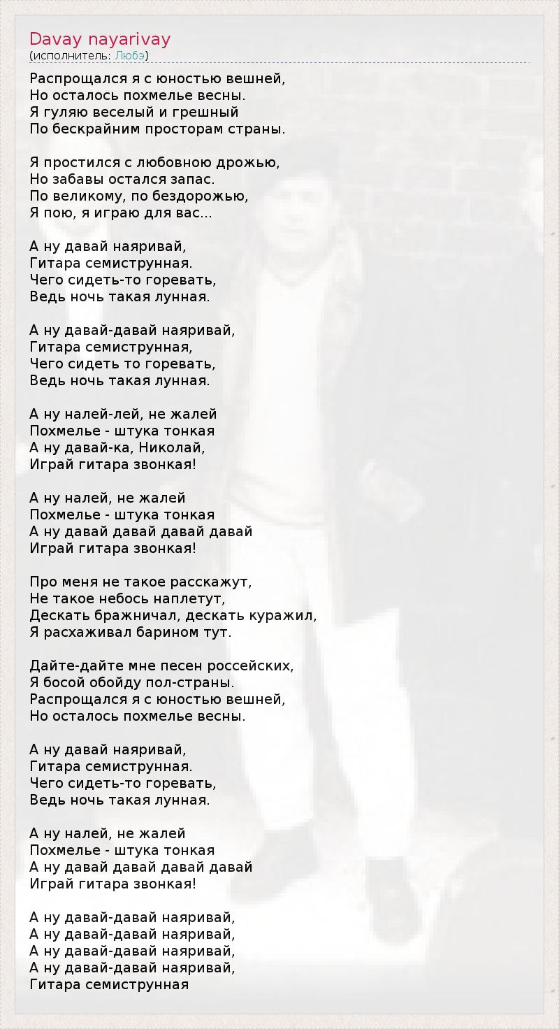 Распрощался я с юностью вешней, Но осталось похмелье весны. Я гуляю веселый и грешный По бескрайним просторам страны. Я простился с любовною дрожью, Но забавы остался запас. По великому, по бездорожью, Я пою, я играю для вас... А ну давай наяривай, Гитара семиструнная. Чего сидеть-то горевать, Ведь ночь такая лунная. А ну давай-давай наяривай, Гитара семиструнная, Чего сидеть то горевать, Ведь ночь такая лунная. А ну налей-лей, не жалей Похмелье - штука тонкая А ну давай-ка, Николай, Играй гитара звонкая! А ну налей, не жалей Похмелье - штука тонкая А ну давай давай давай давай Играй гитара звонкая! Про меня не такое расскажут, Не такое небось наплетут, Дескать бражничал, дескать куражил, Я расхаживал барином тут. Дайте-дайте мне песен россейских, Я босой обойду пол-страны. Распрощался я с юностью вешней, Но осталось похмелье весны. А ну давай наяривай, Гитара семиструнная. Чего сидеть-то горевать, Ведь ночь такая лунная. А ну налей, не жалей Похмелье - штука тонкая А ну давай давай давай давай Играй гитара звонкая! А ну давай-давай наяривай, А ну давай-давай наяривай, А ну давай-давай наяривай, А ну давай-давай наяривай, Гитара семиструнная