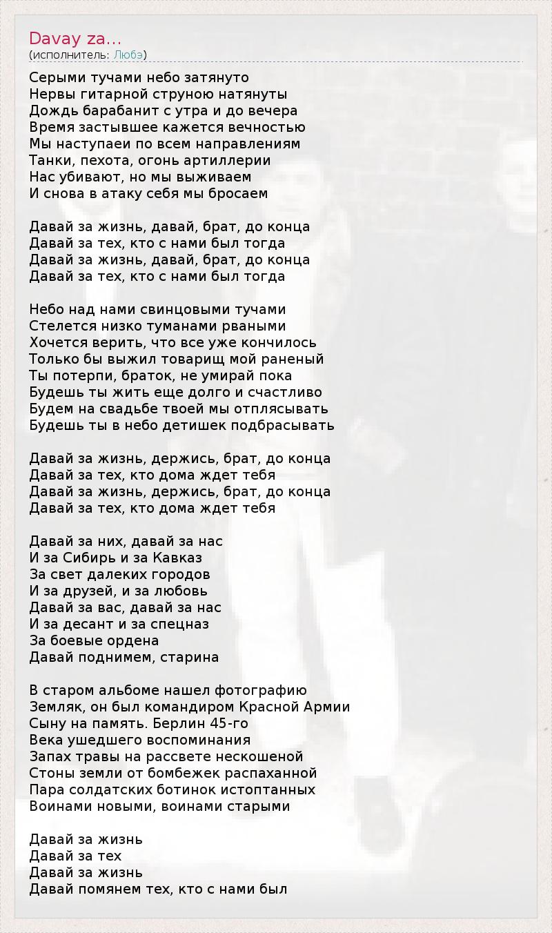 Это интересно:Любэ — российская музыкальная группа, основанная в 1989 году Николаем Расторгуевым и Игорем Матвиенко. В своём творчестве музыканты используют элементы рок-музыки, шансона, русской народной музыки и авторской песни, поэтому «Любэ» сложно отнести к какому-либо одному стилю.Идея создания группы «Любэ» принадлежит продюсеру и композитору Игорю Матвиенко, работавшему в то время в Студии... продолжение