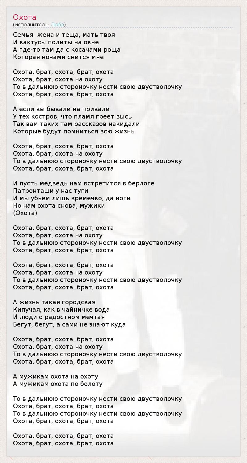 Семья: жена и теща, мать твоя И кактусы политы на окне А где-то там да с косачами роща Которая ночами снится мне Охота, брат, охота, брат, охота Охота, брат, охота на охоту То в дальнюю стороночку нести свою двустволочку Охота, брат, охота, брат, охота А если вы бывали на привале У тех костров, что пламя греет высь Так вам таких там рассказов накидали Которые будут помниться всю жизнь Охота, брат, охота, брат, охота Охота, брат, охота на охоту То в дальнюю стороночку нести свою двустволочку Охота, брат, охота, брат, охота И пусть медведь нам встретится в берлоге Патронташи у нас туги И мы убьем лишь времечко, да ноги Но нам охота снова, мужики (Охота) Охота, брат, охота, брат, охота Охота, брат, охота на охоту То в дальнюю стороночку нести свою двустволочку Охота, брат, охота, брат, охота Охота, брат, охота, брат, охота Охота, брат, охота на охоту То в дальнюю стороночку нести свою двустволочку Охота, брат, охота, брат, охота А жизнь такая городская Кипучая, как в чайничке вода И люди о радостном мечтая Бегут, бегут, а сами не знают куда Охота, брат, охота, брат, охота Охота, брат, охота на охоту То в дальнюю стороночку нести свою двустволочку Охота, брат, охота, брат, охота А мужикам охота на охоту А мужикам охота по болоту То в дальнюю стороночку нести свою двустволочку Охота, брат, охота, брат, охота То в дальнюю стороночку нести свою двустволочку Охота, брат, охота, брат, охота Охота, брат, охота, брат, охота Охота, брат, охота, брат, охота