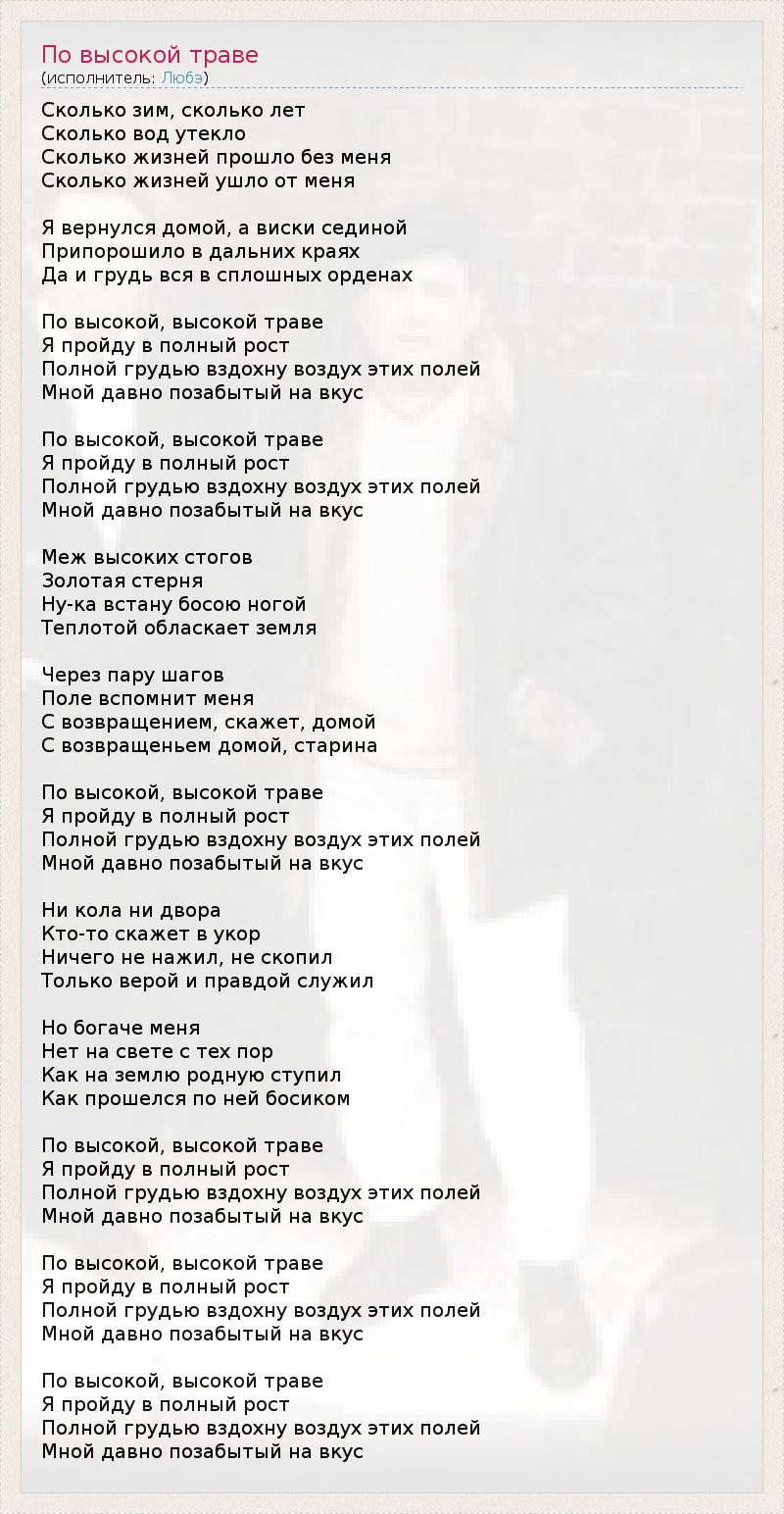 Сколько зим, сколько лет Сколько вод утекло Сколько жизней прошло без меня Сколько жизней ушло от меня Я вернулся домой, а виски сединой Припорошило в дальних краях Да и грудь вся в сплошных орденах По высокой, высокой траве Я пройду в полный рост Полной грудью вздохну воздух этих полей Мной давно позабытый на вкус По высокой, высокой траве Я пройду в полный рост Полной грудью вздохну воздух этих полей Мной давно позабытый на вкус Меж высоких стогов Золотая стерня Ну-ка встану босою ногой Теплотой обласкает земля Через пару шагов Поле вспомнит меня С возвращением, скажет, домой С возвращеньем домой, старина По высокой, высокой траве Я пройду в полный рост Полной грудью вздохну воздух этих полей Мной давно позабытый на вкус Ни кола ни двора Кто-то скажет в укор Ничего не нажил, не скопил Только верой и правдой служил Но богаче меня Нет на свете с тех пор Как на землю родную ступил Как прошелся по ней босиком По высокой, высокой траве Я пройду в полный рост Полной грудью вздохну воздух этих полей Мной давно позабытый на вкус По высокой, высокой траве Я пройду в полный рост Полной грудью вздохну воздух этих полей Мной давно позабытый на вкус По высокой, высокой траве Я пройду в полный рост Полной грудью вздохну воздух этих полей Мной давно позабытый на вкус
