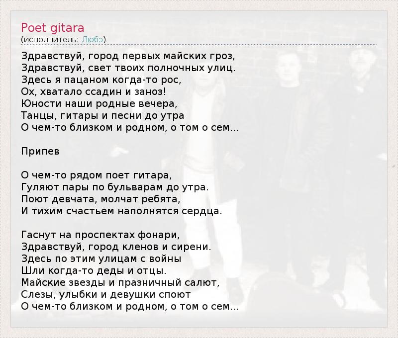 Здравствуй, город первых майских гроз, Здравствуй, свет твоих полночных улиц. Здесь я пацаном когда-то рос, Ох, хватало ссадин и заноз! Юности наши родные вечера, Танцы, гитары и песни до утра О чем-то близком и родном, о том о сем... Припев О чем-то рядом поет гитара, Гуляют пары по бульварам до утра. Поют девчата, молчат ребята, И тихим счастьем наполнятся сердца. Гаснут на проспектах фонари, Здравствуй, город кленов и сирени. Здесь по этим улицам с войны Шли когда-то деды и отцы. Майские звезды и празничный салют, Слезы, улыбки и девушки споют О чем-то близком и родном, о том о сем...