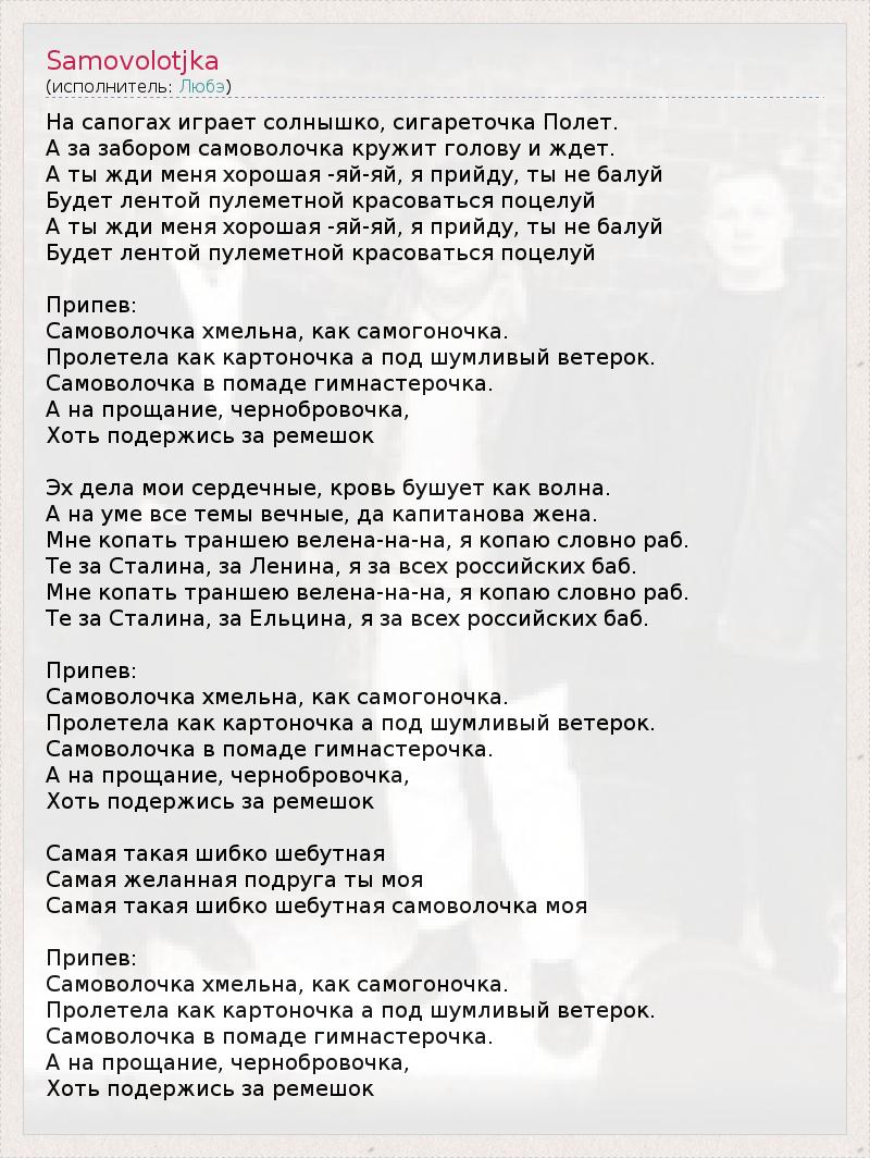 На сапогах играет солнышко, сигареточка Полет. А за забором самоволочка кружит голову и ждет. А ты жди меня хорошая -яй-яй, я прийду, ты не балуй Будет лентой пулеметной красоваться поцелуй А ты жди меня хорошая -яй-яй, я прийду, ты не балуй Будет лентой пулеметной красоваться поцелуй Припев: Самоволочка хмельна, как самогоночка. Пролетела как картоночка а под шумливый ветерок. Самоволочка в помаде гимнастерочка. А на прощание, чернобровочка, Хоть подержись за ремешок Эх дела мои сердечные, кровь бушует как волна. А на уме все темы вечные, да капитанова жена. Мне копать траншею велена-на-на, я копаю словно раб. Те за Сталина, за Ленина, я за всех российских баб. Мне копать траншею велена-на-на, я копаю словно раб. Те за Сталина, за Ельцина, я за всех российских баб. Припев: Самоволочка хмельна, как самогоночка. Пролетела как картоночка а под шумливый ветерок. Самоволочка в помаде гимнастерочка. А на прощание, чернобровочка, Хоть подержись за ремешок Самая такая шибко шебутная Самая желанная подруга ты моя Самая такая шибко шебутная самоволочка моя Припев: Самоволочка хмельна, как самогоночка. Пролетела как картоночка а под шумливый ветерок. Самоволочка в помаде гимнастерочка. А на прощание, чернобровочка, Хоть подержись за ремешок