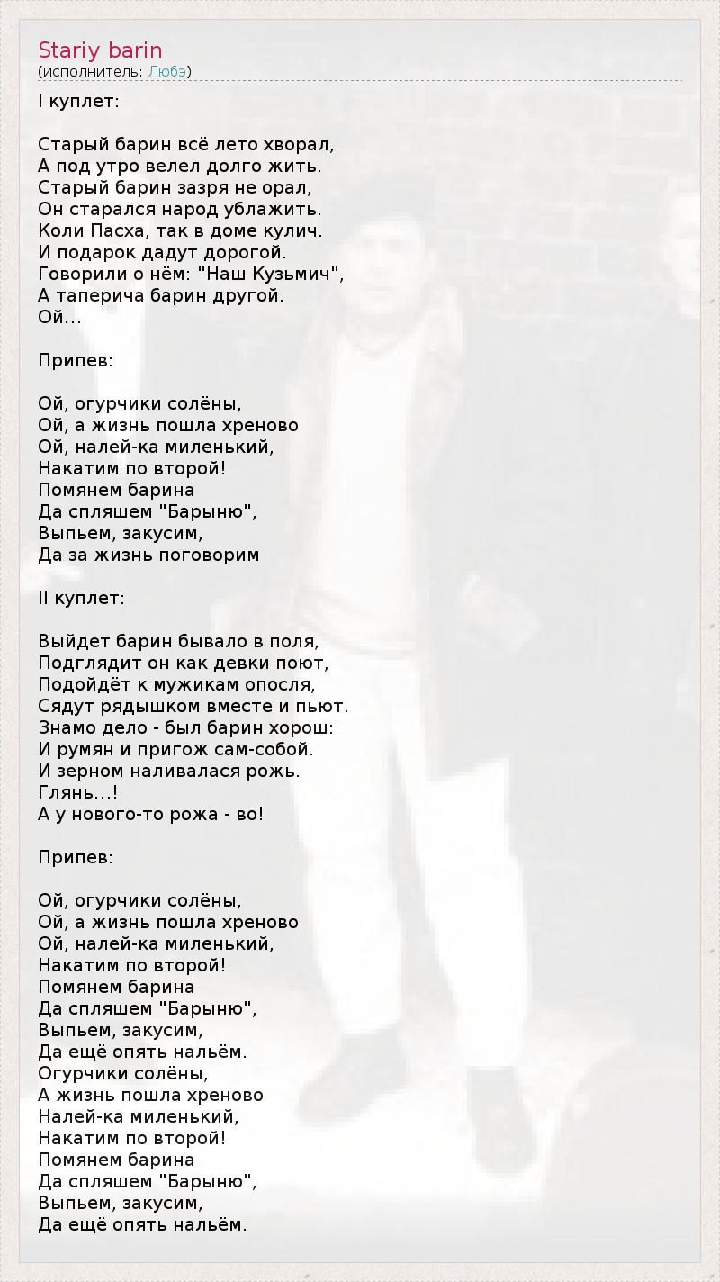 А как ты думаешь, о чем песня "Stariy barin" ?