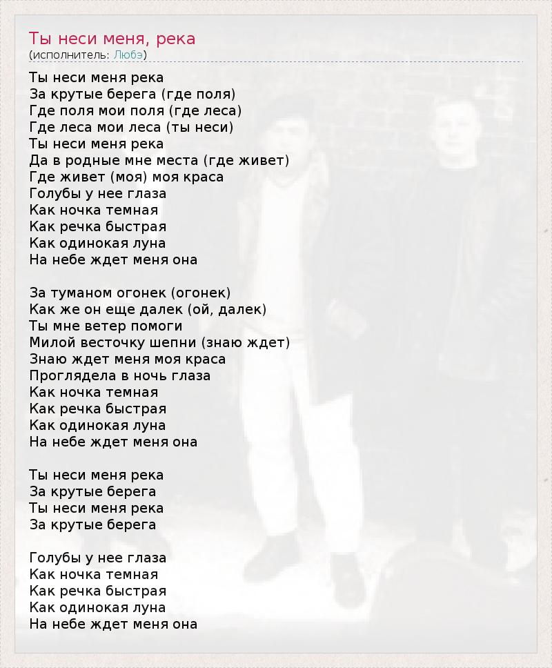 Ты неси меня река За крутые берега (где поля) Где поля мои поля (где леса) Где леса мои леса (ты неси) Ты неси меня река Да в родные мне места (где живет) Где живет (моя) моя краса Голубы у нее глаза Как ночка темная Как речка быстрая Как одинокая луна На небе ждет меня она За туманом огонек (огонек) Как же он еще далек (ой, далек) Ты мне ветер помоги Милой весточку шепни (знаю ждет) Знаю ждет меня моя краса Проглядела в ночь глаза Как ночка темная Как речка быстрая Как одинокая луна На небе ждет меня она Ты неси меня река За крутые берега Ты неси меня река За крутые берега Голубы у нее глаза Как ночка темная Как речка быстрая Как одинокая луна На небе ждет меня она