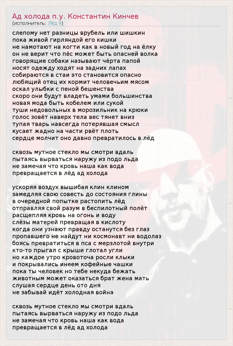 А как ты думаешь, о чем песня "Ад холода п.у. Константин Кинчев" ?