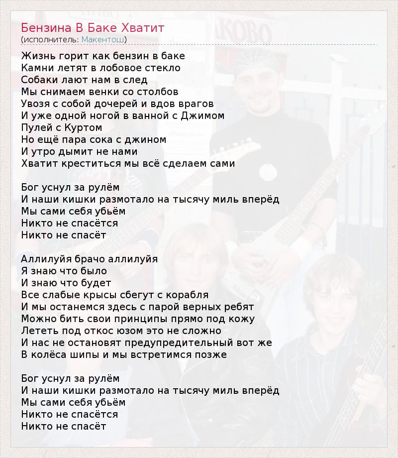 Жизнь горит как бензин в баке Камни летят в лобовое стекло Собаки лают нам в след Мы снимаем венки со столбов Увозя с собой дочерей и вдов врагов И уже одной ногой в ванной с Джимом Пулей с Куртом Но ещё пара сока с джином И утро дымит не нами Хватит креститься мы всё сделаем сами Бог уснул за рулём И наши кишки размотало на тысячу миль вперёд Мы сами себя убьём Никто не спасётся Никто не спасёт Аллилуйя брачо аллилуйя Я знаю что было И знаю что будет Все слабые крысы сбегут с корабля И мы останемся здесь с парой верных ребят Можно бить свои принципы прямо под кожу Лететь под откос юзом это не сложно И нас не остановят предупредительный вот же В колёса шипы и мы встретимся позже Бог уснул за рулём И наши кишки размотало на тысячу миль вперёд Мы сами себя убьём Никто не спасётся Никто не спасёт