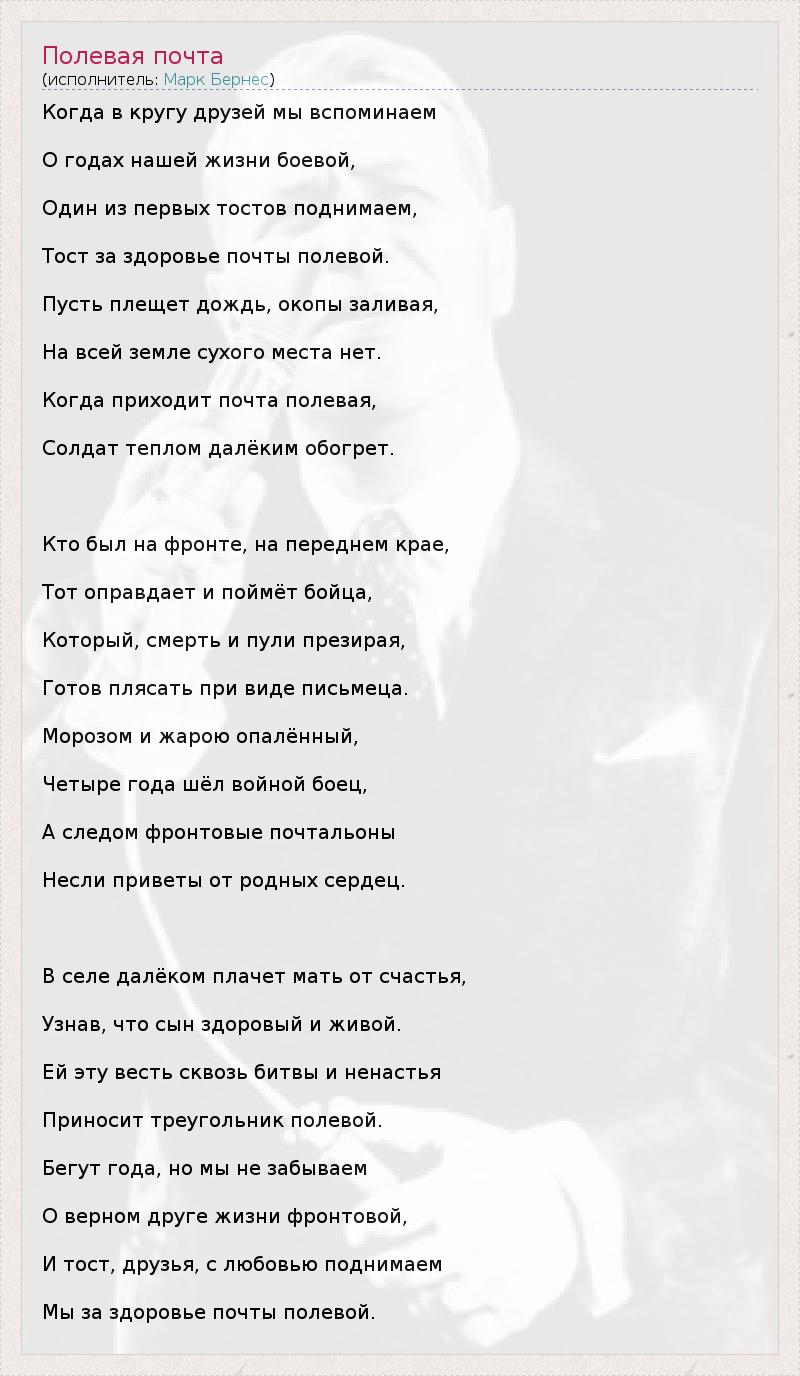Когда в кругу друзей мы вспоминаем О годах нашей жизни боевой, Один из первых тостов поднимаем, Тост за здоровье почты полевой. Пусть плещет дождь, окопы заливая, На всей земле сухого места нет. Когда приходит почта полевая, Солдат теплом далёким обогрет. Кто был на фронте, на переднем крае, Тот оправдает и поймёт бойца, Который, смерть и пули презирая, Готов плясать при виде письмеца. Морозом и жарою опалённый, Четыре года шёл войной боец, А следом фронтовые почтальоны Несли приветы от родных сердец. В селе далёком плачет мать от счастья, Узнав, что сын здоровый и живой. Ей эту весть сквозь битвы и ненастья Приносит треугольник полевой. Бегут года, но мы не забываем О верном друге жизни фронтовой, И тост, друзья, с любовью поднимаем Мы за здоровье почты полевой.